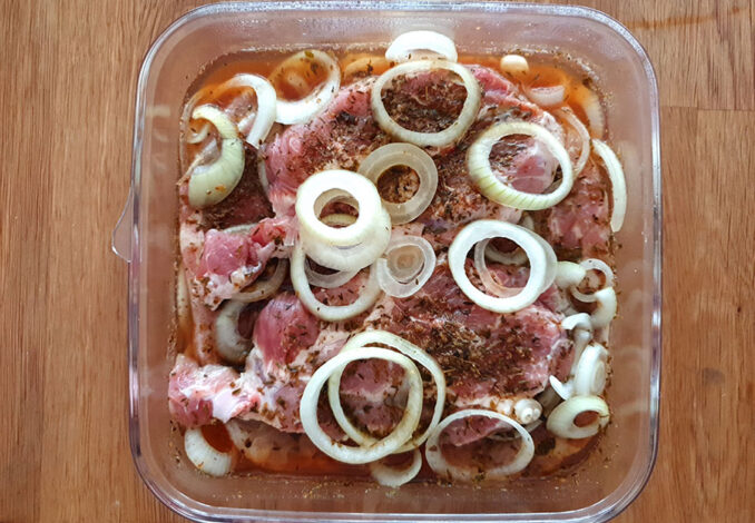 Maak de knoflook en uien schoon en snijd de uien in ringen en hak de knoflook fijn. Maak van de 2 dl water, olijfolie, azijn, uien, knoflook, tijm en de gyroskruiden een marinade. Voeg het vlees erbij en laat dit minimaal 2 uur intrekken, hoe langer hoe beter.