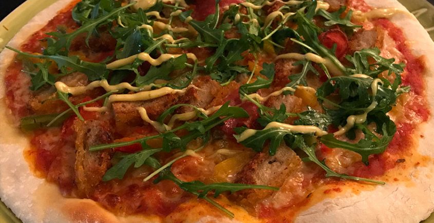 Pizza met gerookte kip, paprika, champignons, mozzarella, rucola en besprenkeld met Vadouvansaus.